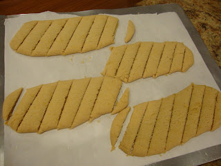 8. Cut bars, at an angle, into slices while still hot—I cut off the rounded ends, then slice each roll into 6 slices to make 2 dozen cookies per batch.